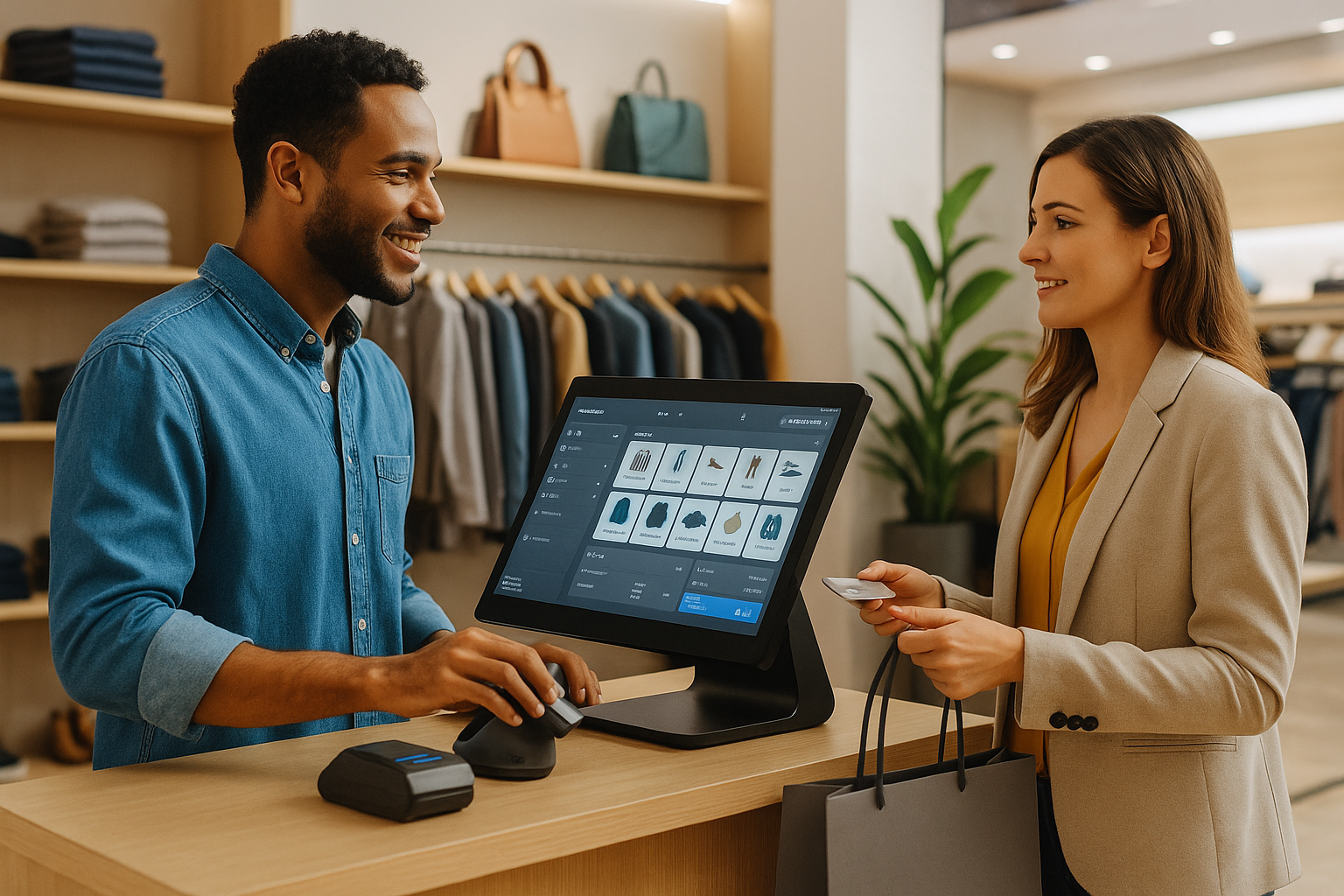 The POS screen lets you browse products from left to right, add items instantly, and finalize your sale with a single tap.